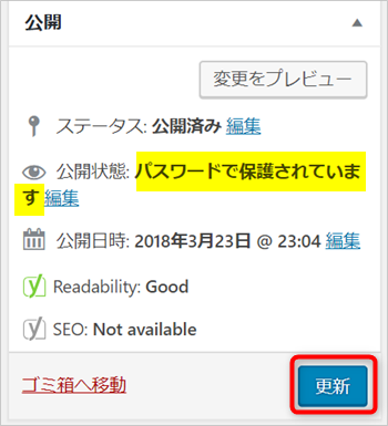 「OK」をクリックするとパスワードで保護されていますと表示されますので、「更新」ボタンをクリックします。これで設定完了です。
