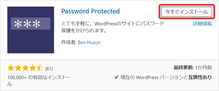プラグイン検索窓に「Password Protected」と入力するとプラグインが表示されますので、「今すぐインストール」をクリックします。インストール終了後「有効化」をクリックして、プラグインを有効化します。
