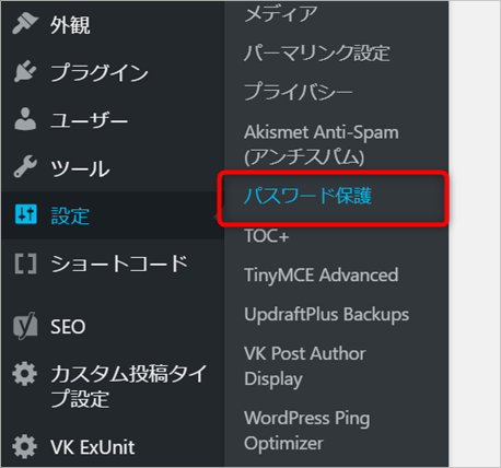 メニューの「設定」項目をクリックすると、「パスワード保護」という名称でプラグインが追加されたことが確認できます。