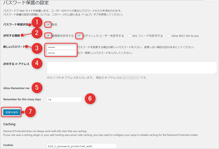 1. パスワード保護状況:有効にチェックを入れるとサイト全体がパスワードで保護されます